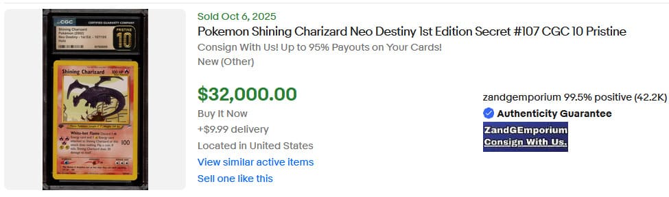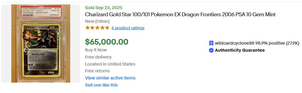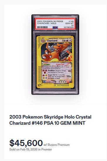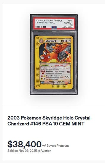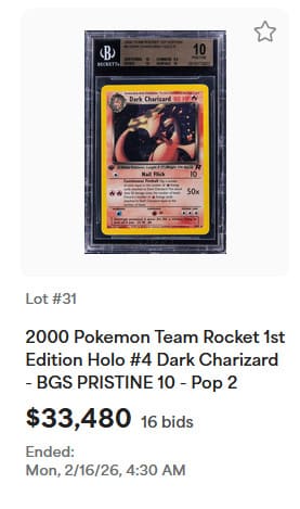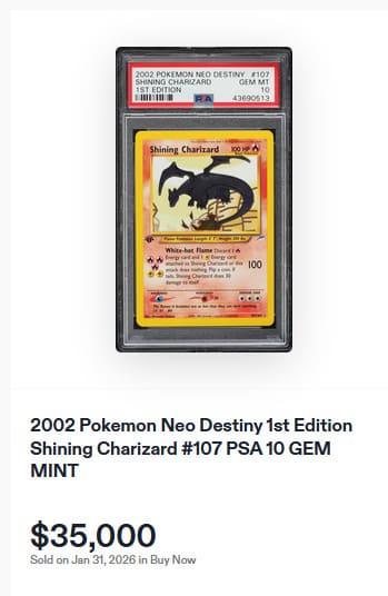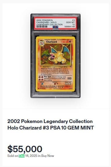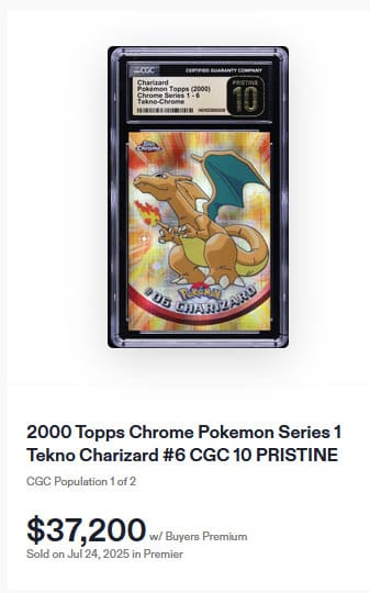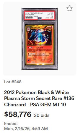Vom Shadowless Charizard existieren insgesamt nur 58 Pokémon-Karten mit PSA-10-Bewertung. Das zuletzt öffentlich angebotene Exemplar wurde am 5. Juli 2025 für 54.600 US-Dollar (ca. 47.000 €) versteigert