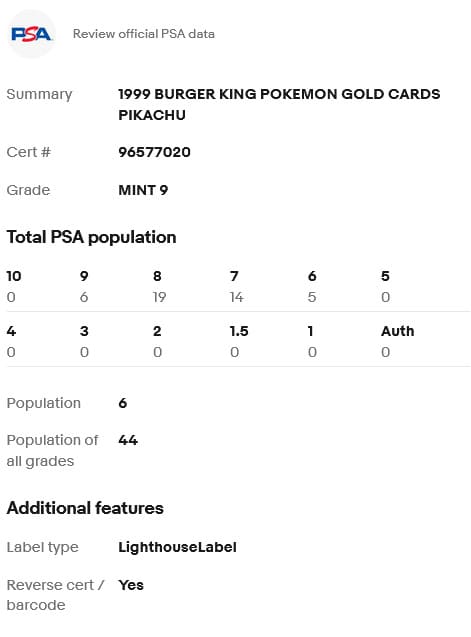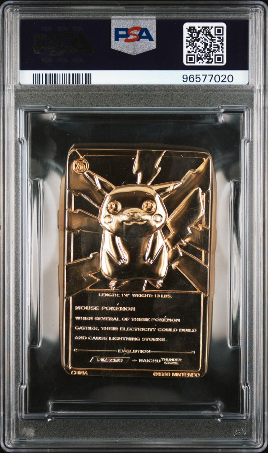 Jede Karte besteht aus massivem Metall und ist mit einer Schicht aus 23-karätigem Gold veredelt. Während unbewertete Exemplare üblicherweise für unter 100 € erhältlich sind, werden bewertete Karten nur selten auf dem Markt angeboten. Zum Zeitpunkt dieses Artikels hat PSA insgesamt 44 Pikachu-Karten bewertet – davon erhielten lediglich sechs Exemplare die Bewertung PSA 9. Aktuell werden für dieses goldene Sammlerstück bis zu 8.500 € gezahlt.