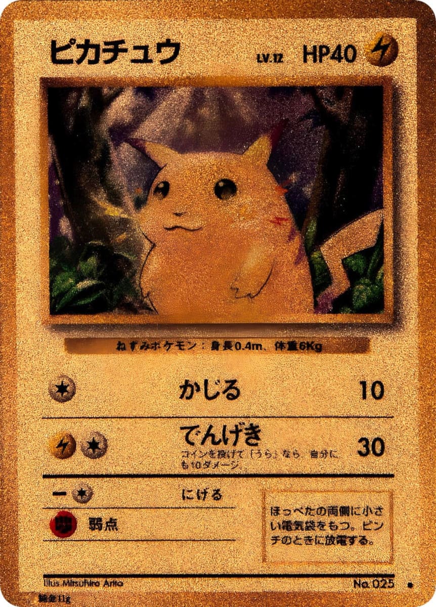 Eine der exklusiven Promokarten ist ein einzigartiger Nachdruck von Pikachu aus dem Basis-Set, der tatsächlich aus 11 Gramm 24-karätigem Gold gefertigt ist. Diese Echtgold-Pokémon-Karte wurde in Zusammenarbeit mit dem japanischen Schmuckhersteller „Ginza Tanaka“ veröffentlicht und war nicht einfach käuflich zu erwerben. Interessierte Sammler hatten stattdessen die Möglichkeit, an einer Verlosung teilzunehmen, bei der die Gewinner dieses einzigartige Sammlerstück für 216.000 Yen (ca. 1.300 €) kaufen konnten. Bis dato ist unbekannt, wie viele Exemplare tatsächlich verkauft wurden. Die weltweit einzige CGC-8-Karte wurde bei einer Auktion des renommierten US-amerikanischen Auktionsunternehmens Goldin-Auctions im April 2024 für stolze 26.100 € versteigert.