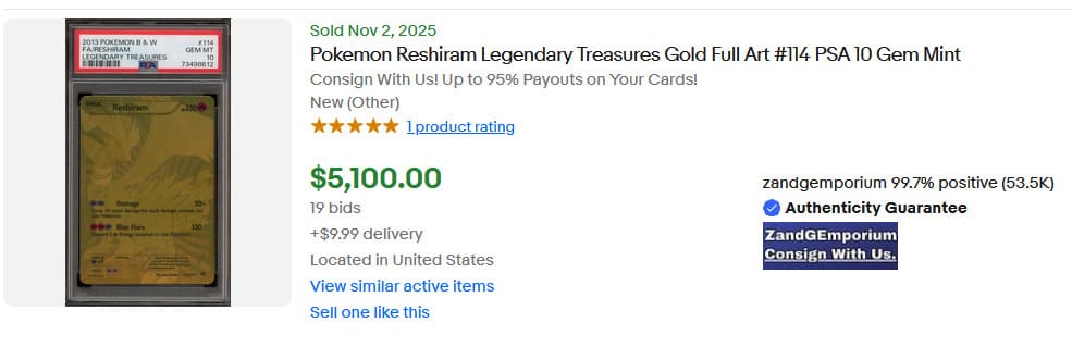 Die goldene Vollbild-Karte von Zekrom aus Legendary Treasures ist noch seltener als Reshiram: PSA hat insgesamt nur 39 Exemplare mit der höchstmöglichen Bewertung ausgezeichnet. Zuletzt wurde eine dieser Karten im November 2025 für 4.400 € versteigert.