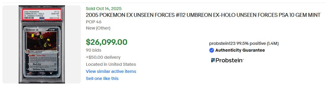 Seit ihrer Rückkehr in der Karmesin & Purpur-Serie sind die mächtigen Pokémon-ex-Karten derzeit so gefragt wie nie zuvor. Hier siehst du die allererste Nachtara-ex-Karte aus der Erweiterung EX Verborgene Mächte, die im August 2005 erschienen ist. Mit insgesamt nur 46 Exemplaren in PSA-10-Qualität sind diese Karten äußerst selten. Das zuletzt verkaufte Exemplar erzielte am 14. Oktober 2025 einen beeindruckenden Verkaufspreis von 26.099 US-Dollar (ca. 22.500 €).