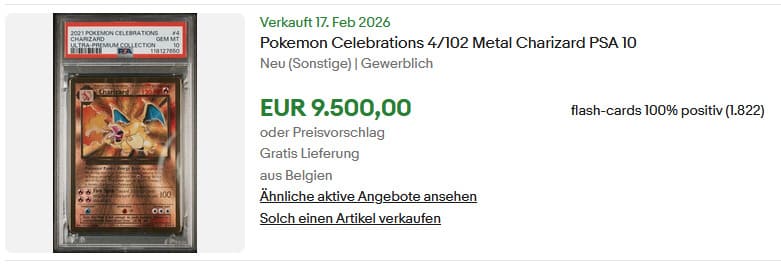 Der aktuelle Marktwert beträgt etwa 130 bis 200 €. Besonders selten sind einwandfreie PSA-10-Exemplare: Von über 14.900 bewerteten Karten wurde nur 644 mit der begehrten Höchstbewertung ausgezeichnet. Zuletzt wurde eine dieser Karten am 17. Februar 2026 bei eBay für beeindruckende 9.500 € verkauft.