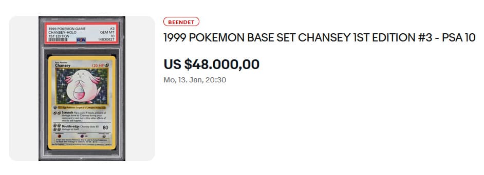 Dieses entzückende Ei-Pokémon ist einfach zum Liebhaben! Chaneira strahlt eine außergewöhnlich warmherzige und freundliche Persönlichkeit aus. Es ist stets bereit, sich um verletzte Pokémon zu kümmern, und ist daher oft in Pokémon-Centern anzutreffen, wo es den Krankenschwestern hilfreich zur Seite steht. Eine makellose englische PSA-10-Karte von Chaneira wurde zuletzt im Januar 2025 bei einer eBay-Auktion für bemerkenswerte 48.000 US-Dollar (ca. 41.300 €) verkauft. Diese hohe Wertigkeit ist unter anderem darauf zurückzuführen, dass insgesamt nur 48 PSA-10-Exemplare existieren.