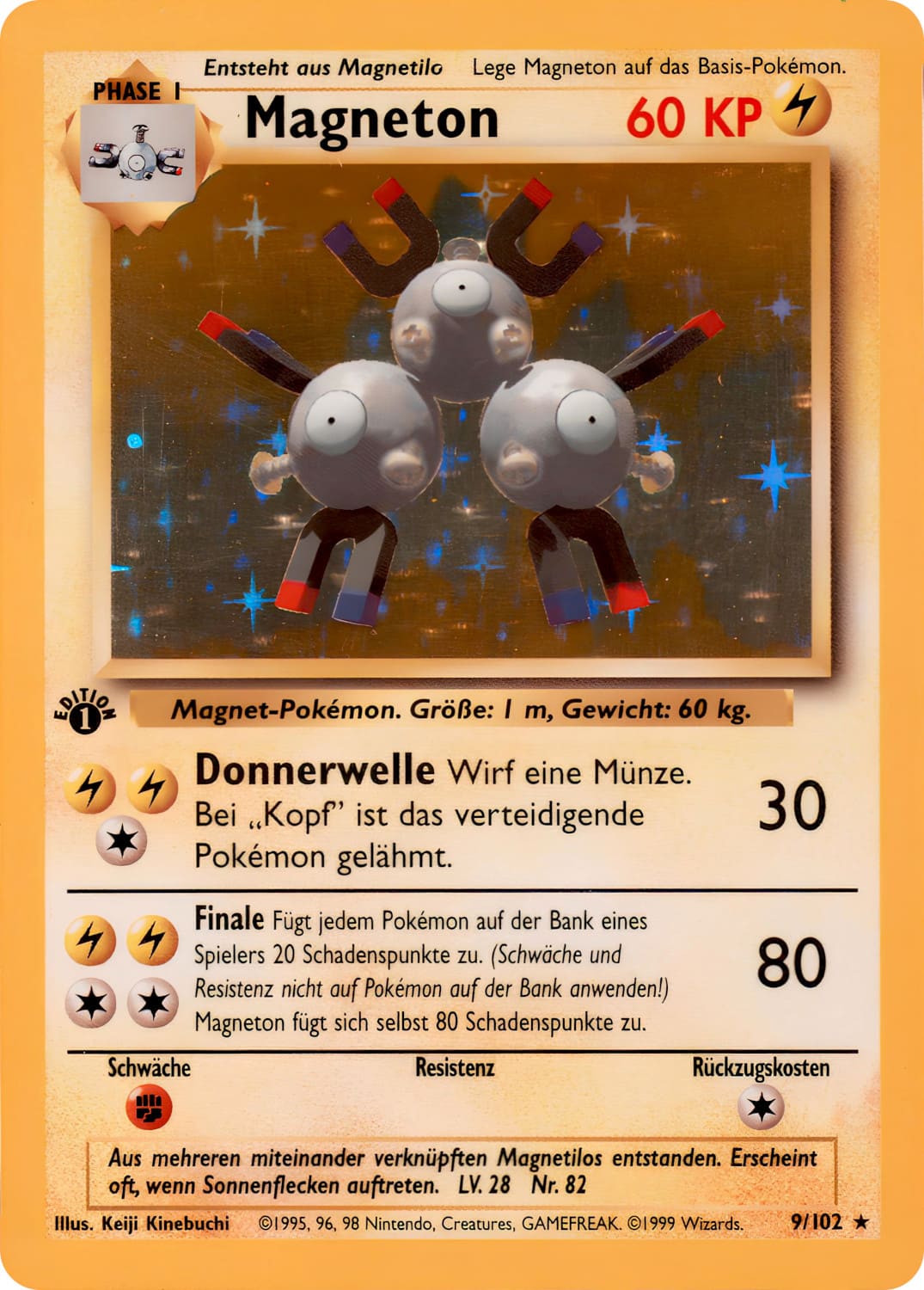 Achtung, Hochspannung! Das Magnet-Pokémon Magneton setzt sich aus einem Kollektiv von drei Magnetilo zusammen. Es tritt besonders häufig in der Nähe von großen Stromleitungen und Kraftwerken auf, wo es sich von Strom ernährt. Sein starkes Magnetfeld kann Elektrogeräte in einem Umkreis von bis zu einem Kilometer beeinträchtigen. In einigen Städten werden die Bewohner deshalb gebeten, Magneton ausschließlich in einem Pokéball zu halten. Makellos erhaltene englische Magneton-Karten mit der begehrten PSA-10-Bewertung sind besonders selten und werden für bis zu 24.600 US-Dollar (ca. 21.200 €) gehandelt.