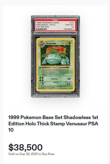 Als Entwicklung des beliebten Starter-Pokémon Bisasam erlangte das mächtige Bisaflor bereits in der ersten Pokémon-Generation große Bekanntheit. Mit seiner imposanten Blüte fängt die gigantische Kröte Sonnenstrahlen ein und wandelt sie in Energie um, um Gegnern mit einem brandheißen Solarstrahl einzuheizen. Spitzenexemplare von Bisaflor aus der limitierten Erstauflage mit einer PSA-10-Bewertung erzielen derzeit Preise von bis zu 38.500 US-Dollar (ca. 33.100 €).