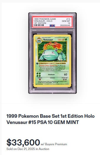 Als finale Entwicklung des beliebten Starter-Pokémon Bisasam erlangte das mächtige Bisaflor bereits in der ersten Pokémon-Generation große Bekanntheit. Mit seiner imposanten Blüte fängt die gigantische Kröte Sonnenstrahlen ein und verwandelt sie in gebündelte Energie, um Gegnern mit seinem brandheißen Solarstrahl einzuheizen. Einwandfreie Exemplare von Bisaflor aus der limitierten Erstauflage erzielen derzeit Preise von bis zu 33.600 US-Dollar (ca. 28.800 €).