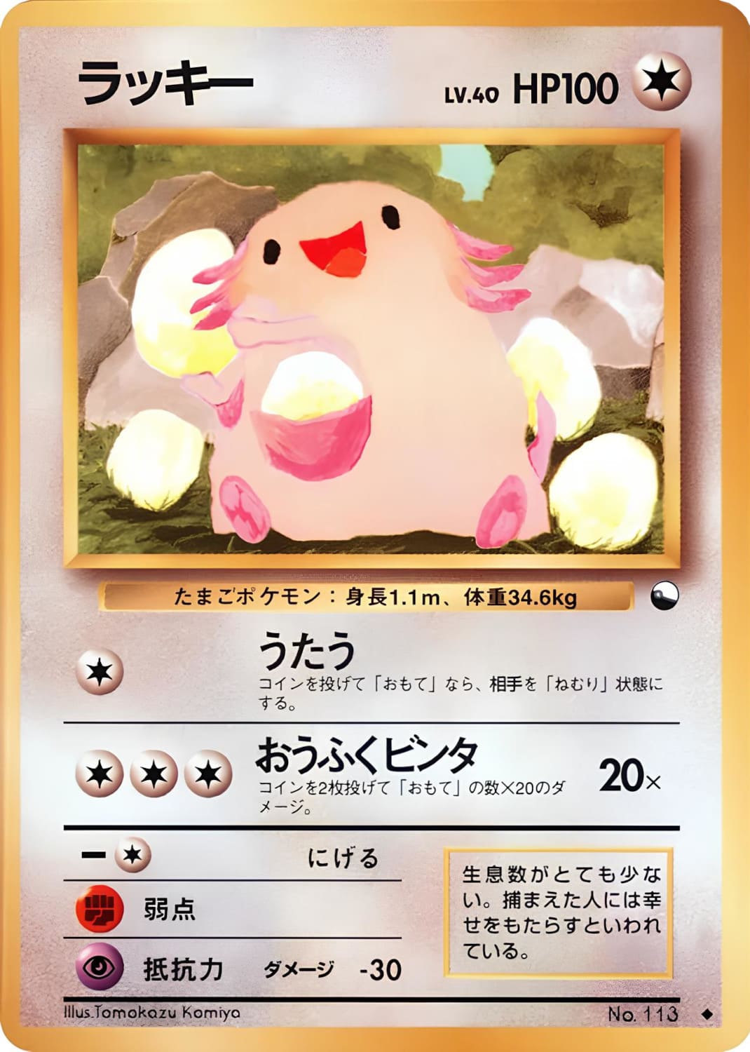 Das liebenswerte Ei-Pokémon Chaneira erscheint in einer niedlichen Zeichnung des berühmten Illustrators Tomokazu Komiya. Der aktuelle Handelswert liegt bei bis zu 810 €.