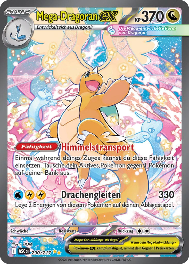 Das allseits beliebte Drachen-Pokémon Dragoran betritt im neuen Set erstmals als mächtiges Mega-Pokémon die Bühne. Neben einer spielbaren Karte erscheint Mega-Dragoran-ex auch auf zahlreichen wertvollen Secret Rares. Besonders gefragt ist die goldene Mega-Ultra-Rare-Karte. Sie taucht nur besonders selten in den Boosterpacks auf – was sie zu einem extrem begehrten Sammlerstück macht. Die zuletzt verkauften Exemplare erzielten Preise von etwa 420 bis 670 €.