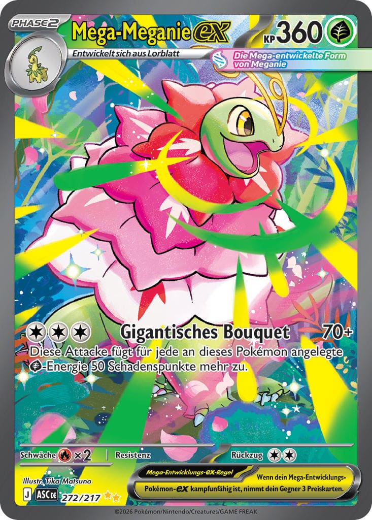 Trainer können in Erhabene Helden zahlreiche Mega-Entwicklungs-Pokémon entdecken, die kürzlich ihr Debüt im erfolgreichen Videospiel Pokémon-Legenden: Z-A gefeiert haben. Das beliebte Kräuter-Pokémon Mega-Meganie-ex erscheint hier erstmals im Sammelkartenspiel. Seine Attacke „Gigantisches Bouquet“ kostet drei beliebige Energien und verursacht einen Grundschaden von 70 Punkten. Für jede angelegte Pflanzen-Energie fügt die Attacke 50 Schadenspunkte mehr zu. Kombiniere den Angriff mit Meganie aus der Erweiterung Mega-Entwicklung, um von der doppelten Schadenserhöhung zu profitieren. Sammler investieren momentan etwa 250 € in die Special-Illustration-Rare-Karte von Mega-Meganie-ex.