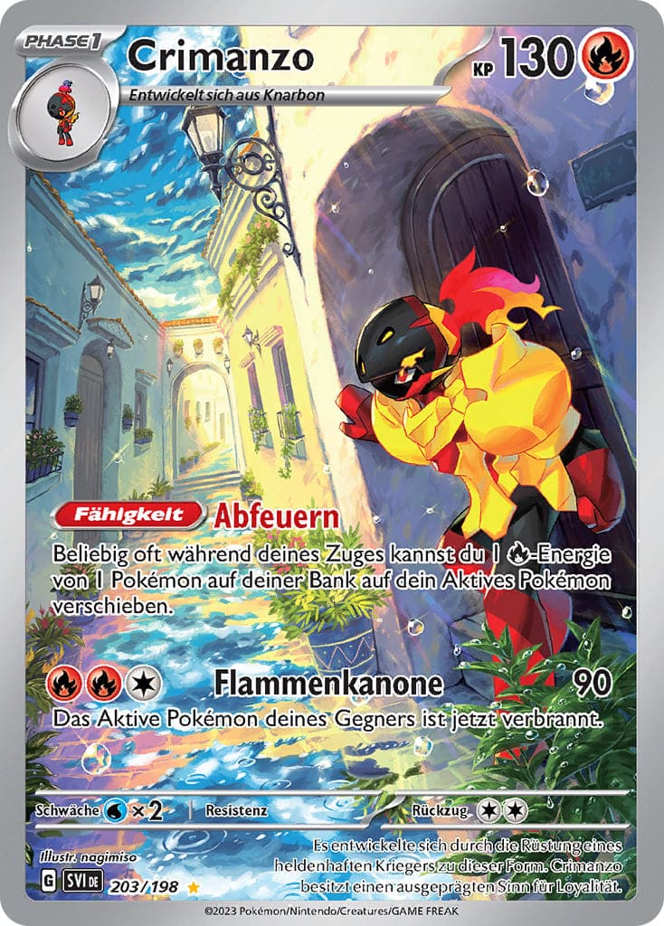 Während seiner Entwicklung aus Knarbon erhält das Feuerrüstungs-Pokémon Crimanzo eine prächtige Rüstung, die nicht nur Schutz vor gegnerischen Attacken bietet, sondern ihm auch ermöglicht, seine brandheißen Feuerangriffe zu entfesseln. Mit seiner Attacke „Flammenkanone“ verursacht es 90 Schadenspunkte und verbrennt das aktive Pokémon deines Gegners. Crimanzos Illustrationskarte geht für etwa 10 bis 15 € über den Ladentisch.
