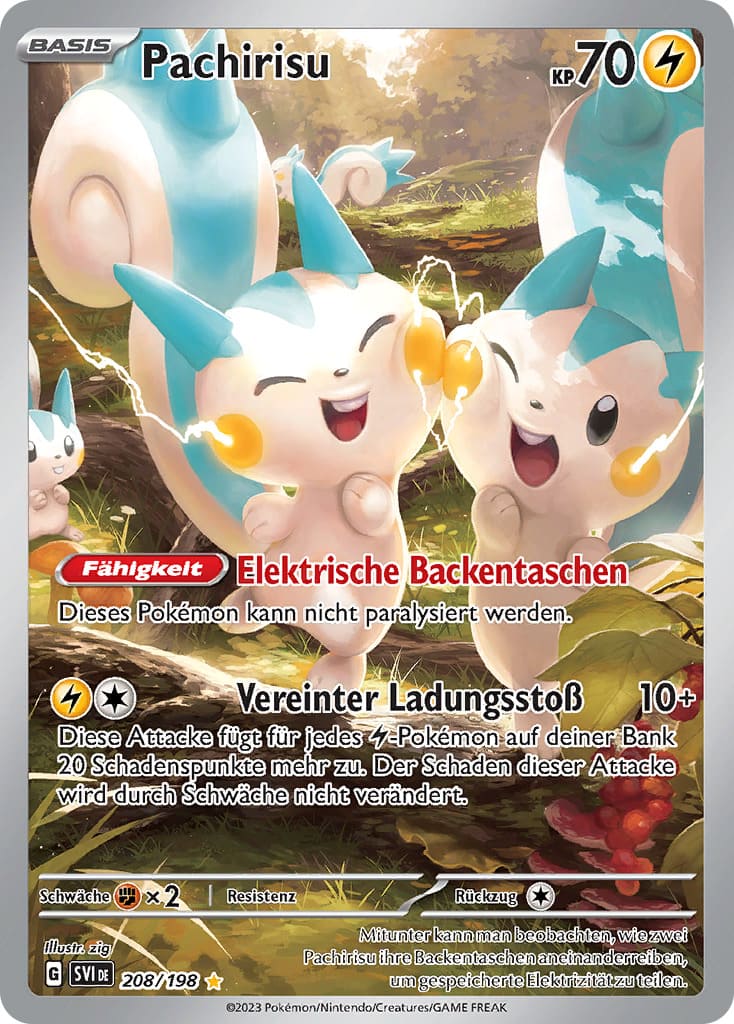 Dieses Duo sprüht vor Energie! Das Elektrohörnchen-Pokémon Pachirisu lebt bevorzugt in Baumwipfeln und ist für seine unglaubliche Geschwindigkeit bekannt. Fühlt es sich bedroht, entlädt es die elektrische Energie aus seinen Backentaschen, um mächtige Ladungsstöße abzufeuern. Wenn du diese fröhliche Illustrationskarte deiner Sammlung hinzufügen möchtest, musst du derzeit etwa 5 bis 15 € bezahlen.