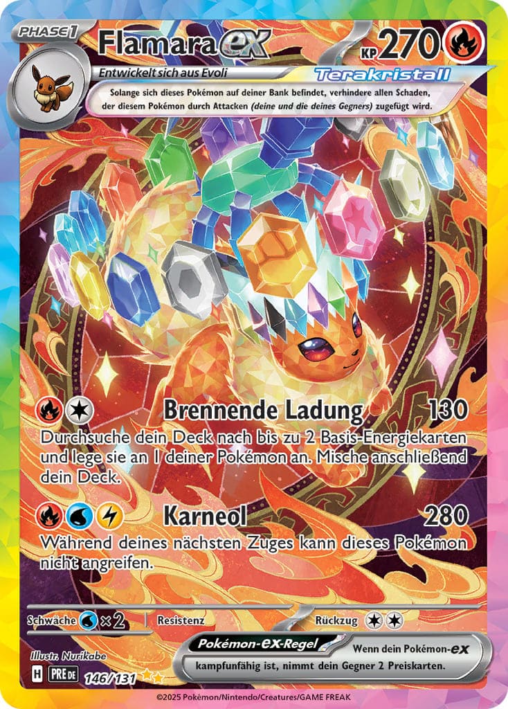 Dieses Feuer-Pokémon bringt ordentlich Hitze in deine Sammlung! Ausgestattet mit einer funkelnden Stellar-Terakristall-Krone entfesselt Flamara-ex seinen brandheißen Karneol-Angriff, der beeindruckende 280 Schadenspunkte verursacht. Der aktuelle Handelswert dieser besonderen Illustrationskarte liegt bei etwa 110 bis 180 €.
