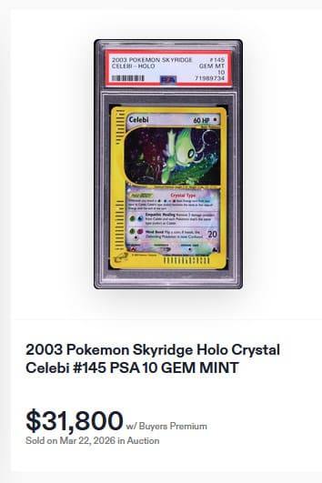 Das kleine Zeitreise-Pokémon Celebi ist für seine hilfsbereite Persönlichkeit bekannt und setzt seine Fähigkeiten ein, um Mitstreiter und Freunde im Duell zu heilen oder zu beschützen. Dies zeigt sich auch in seiner Attacke „Empathische Heilung“, die es dem Spieler ermöglicht, zwei Schadensmarken von Celebi und allen Pokémon desselben Typs zu entfernen. PSA-10-Karten von Kristall-Celebi erreichen derzeit Preise von bis zu 27.500 €.