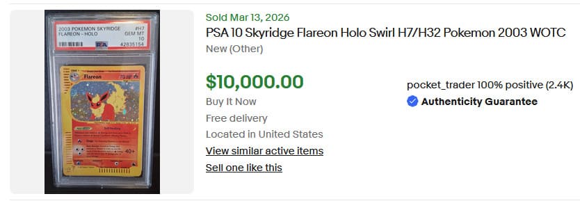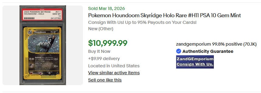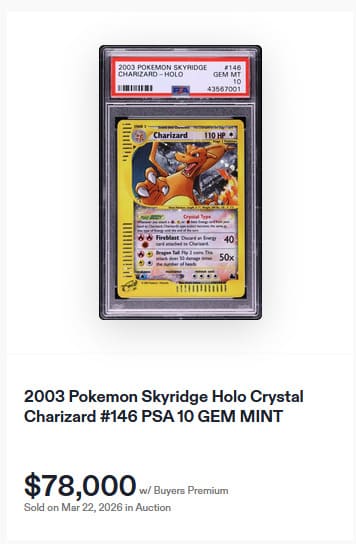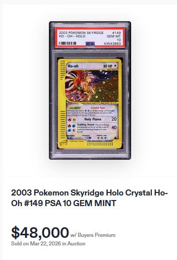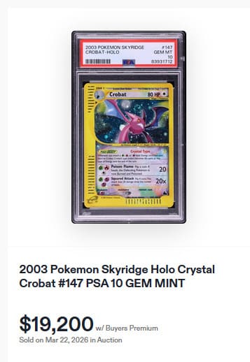 Das majestätische Mondschein-Pokémon Nachtara zählt zu den begehrtesten Sammlerstücken aus Skyridge. Mit seinem „Finsteren Blick“ sorgt Nachtara dafür, dass Pokémon auf der Bank keine Poké-Power mehr einsetzen können. Anschließend schlägt es mit seinen „Scharfen Klauen“ zu. Eine seltene englische PSA-10-Karte wechselte am 22. März 2026 für beeindruckende 45.700 € den Besitzer.