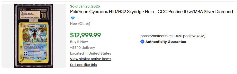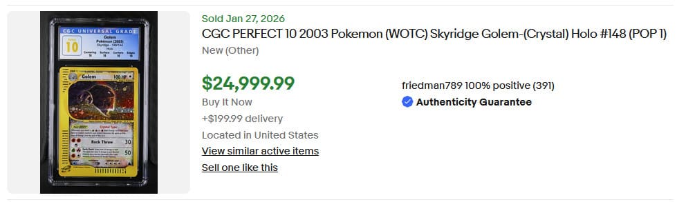 Die weltweit einzige Kristall-Golem-Karte mit der Bewertung „CGC Perfect 10“ wurde am 27. Januar 2026 für 21.650 € verkauft.