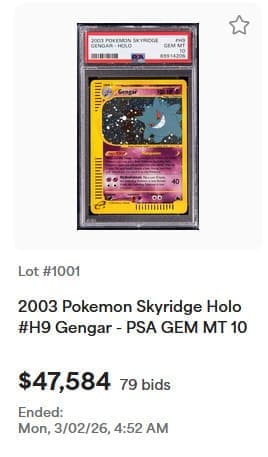 Gengar ist sehr schelmisch und manchmal sogar bösartig. Es spielt gerne Streiche – etwa indem es vorgibt, der Schatten einer Person zu sein. Anschließend belegt es seine Opfer mit schrecklichen Flüchen. Mit seinem fiesen Grinsen und der Fähigkeit, Angst und Schrecken zu verbreiten, hat das Geist-Pokémon die Herzen von Fans auf der ganzen Welt erobert. Am 2. März 2026 erreichte das holografische Gengar aus Skyridge einen neuen Höchstpreis von 41.200 €.