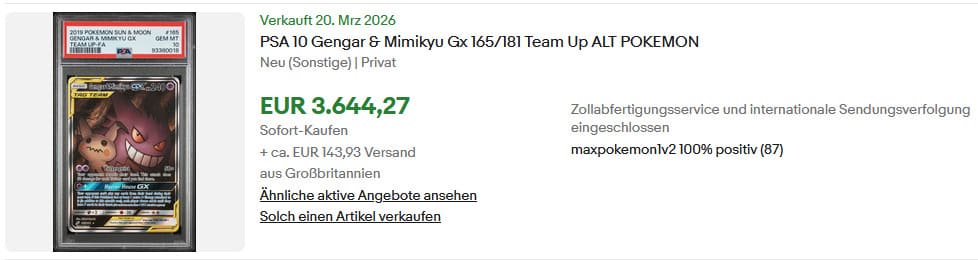 Obwohl es sich um eine reguläre GX-Karte mit niedriger Seltenheit handelt, sind Gengar & Mimigma-GX so begehrt, das gut erhaltene Exemplare Preise von etwa 170 bis 240 € erzielen. Englische PSA-10-Karten wechseln sogar für bis zu 1.100 € den Besitzer.