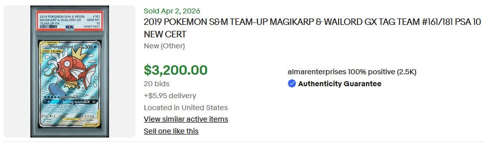 Auch wenn das kleine Karpador nicht als der beste Kämpfer bekannt ist, müssen sich seine Gegner dank der Unterstützung des riesigen Flutwal-Pokémon Wailord auf einen Superplatscher gefasst machen! Ihre wunderschöne Alternate-Art-Pokémon-Karte zählt derzeit zu den beliebtesten Sammlerstücken aus Teams sind Trumpf und wird für etwa 500 bis 1.200 € gehandelt. Seltene PSA-10-Exemplare von Karpador & Wailord-GX erreichen sogar Preise von bis zu 2.750 €.