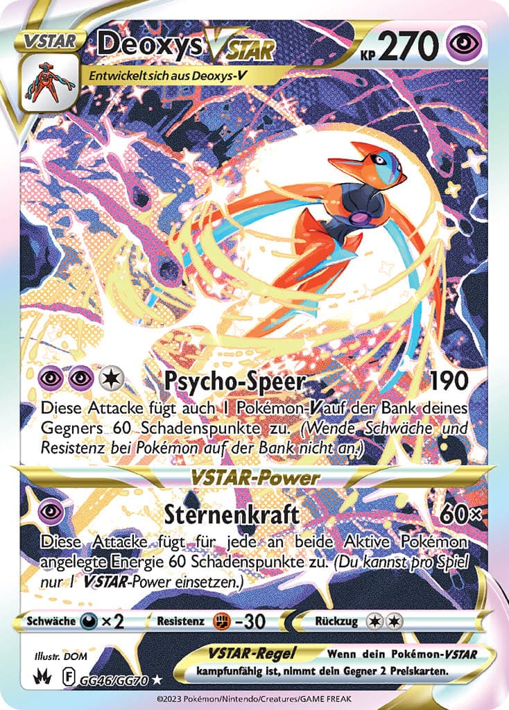 Das roboterartige DNS-Pokémon Deoxys stammt Legenden zufolge nicht von dieser Welt und kann unterschiedliche Formen annehmen. Es steht in einer jahrhundertelangen Fehde mit Rayquaza um die Ozonschicht der Erde, die beide als ihren Lebensraum beanspruchen. Die Galar-Galerie-Karte von Deoxys-VSTAR erzielte zuletzt Preise zwischen etwa 20 und 40 €.