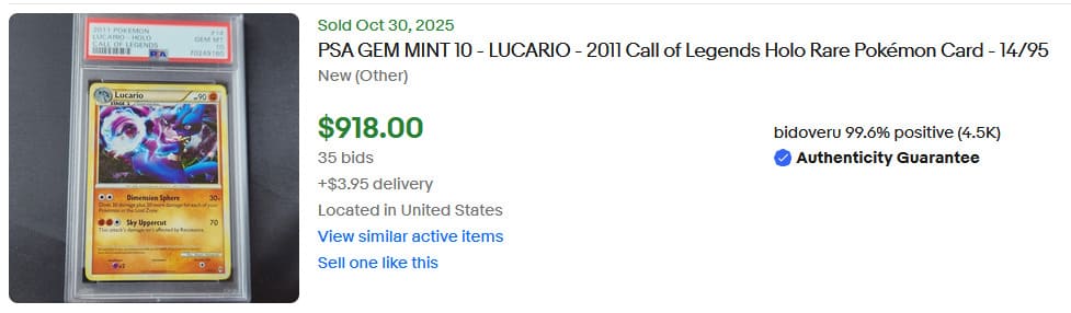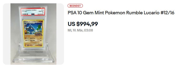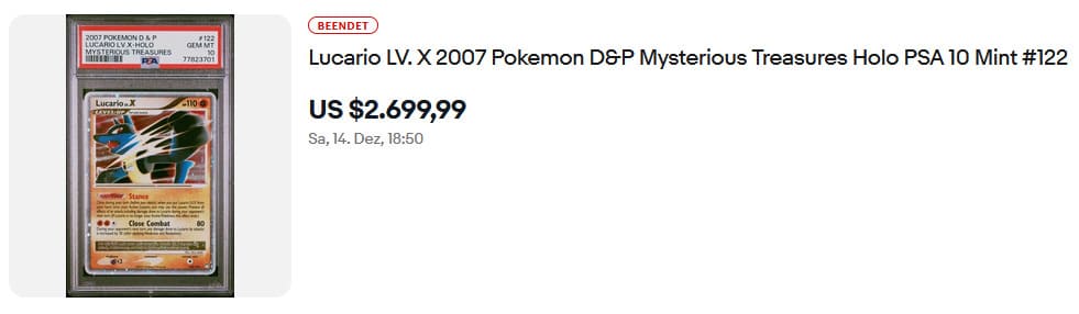 Eine englische PSA-10-Karte von Lucario LV.X aus dem Set Geheimnisvolle Schätze erzielte im Dezember bei einer eBay-Auktion 2.300 €.