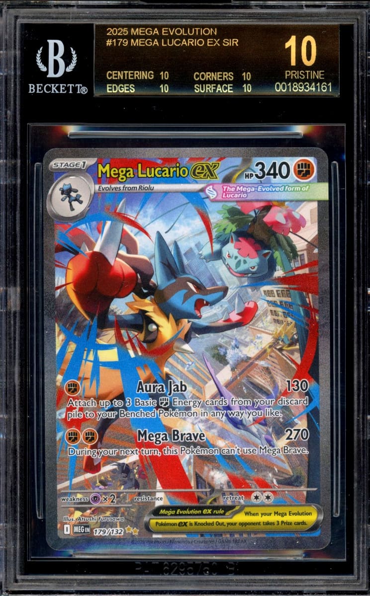 Diese alternative Full-Art-Karte von Mega-Lucario-EX war exklusiv in der Mega Powers Collection erhältlich, die im Mai 2017 ausschließlich in englischer Sprache erschien. Die Karte wurde nie auf Deutsch veröffentlicht. Ein seltenes PSA-10-Exemplar erzielte am 19. Oktober 2025 einen beeindruckenden Verkaufspreis von 1.050 €.