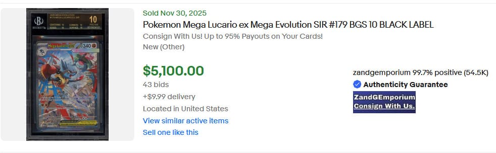 Bist du bereit für actiongeladene Duelle? Auf dieser beeindruckenden Illustrationskarte entfesseln zahlreiche Mega-Entwicklungs-Pokémon ihre stärksten Angriffe. Mega-Lucario-ex stürzt furchtlos mit seinen Fäusten auf Mega-Bisaflor, das mit blitzschnellen Rankenhieben kontert. Die Special-Illustration-Rare-Karte von Mega-Lucario-ex ist unter Sammlern äußerst begehrt. Während unbewertete Exemplare Preise von bis zu 180 € erreichen, wurde eine von nur drei makellosen Black-Label-Karten am 30. November 2025 für unglaubliche 4.350 € versteigert.