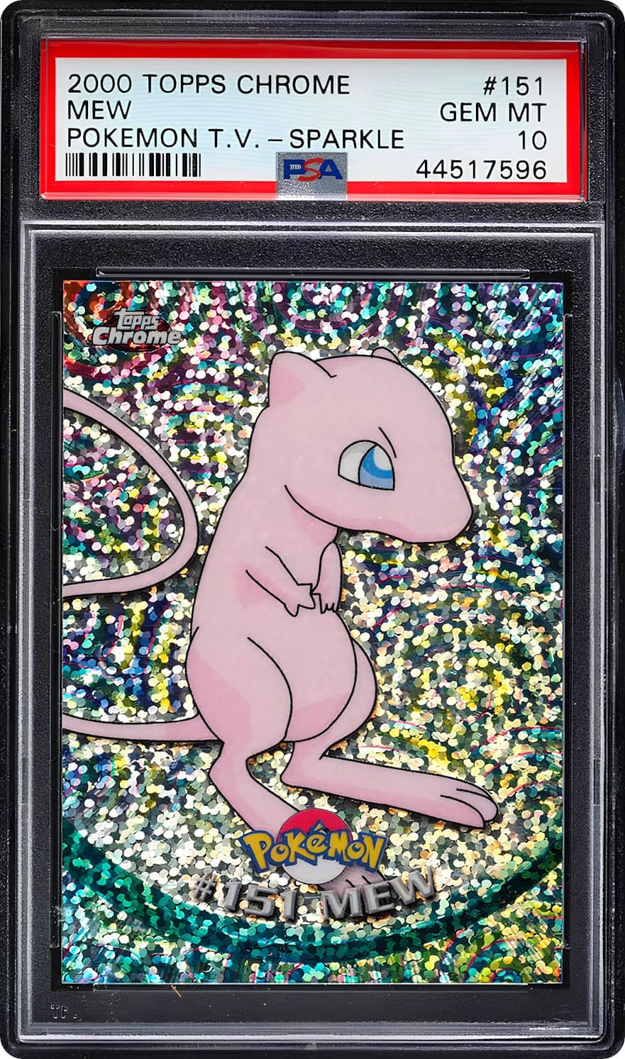 Die Anfang der 2000er-Jahre veröffentlichten Topps-Chrome-Karten fallen durch ihre auffälligen geprägten Oberflächen und glänzenden holografischen Effekte auf. Sie kommen in vier Seltenheitsstufen vor, wobei Chrome Sparkle nur in etwa einem von zehn Boosterpacks auftauchte. Das kleine Psycho-Pokémon Mew zählt zu den absoluten Fan-Favoriten aus der Topps-Chrome-Serie. Ein seltenes PSA-10-Exemplar fand am 02. November 2025 für 16.200 US-Dollar (ca. 13.900 €) einen neuen Besitzer.