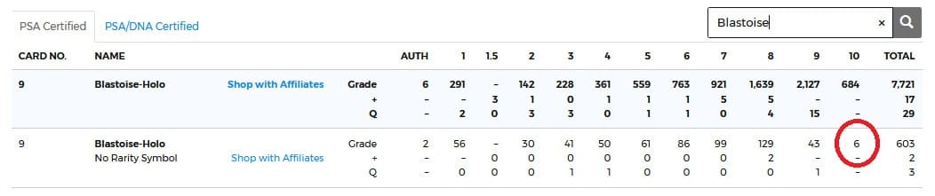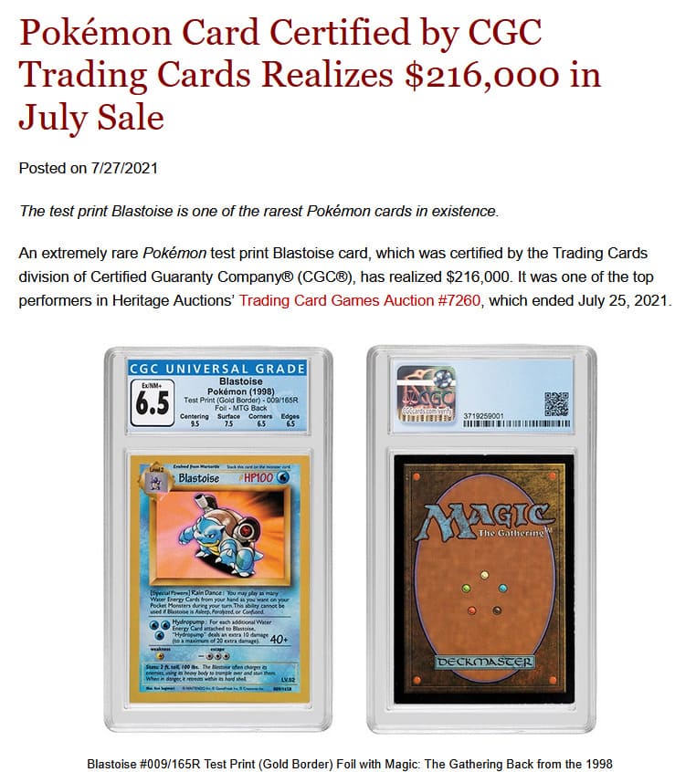 Ein von CGC bewertetes Exemplar dieser Blastoise-Test-Print-Karte wurde im Juli 2021 für beeindruckende 216.000 US-Dollar (ca. 183.000 €) versteigert.