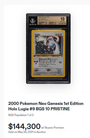 Die erste jemals veröffentlichte Pokémon-Karte von Lugia aus der Neo-Genesis-Erweiterung gehört bis heute zu den absoluten Highlights unter Sammlern. Vor allem Fans des legendären Flug-Pokémon jagen ihr seit über 20 Jahren hinterher. Ein besonders seltenes Exemplar aus der limitierten 1. Edition erhielt von Beckett die fast makellose Bewertung „Pristine 10“ – die zweithöchste Note, die das strenge Grading-Unternehmen überhaupt vergibt. Im Mai 2021 wechselte diese Karte bei einer Auktion für stolze 144.000 US-Dollar (ca. 122.600 €) den Besitzer.