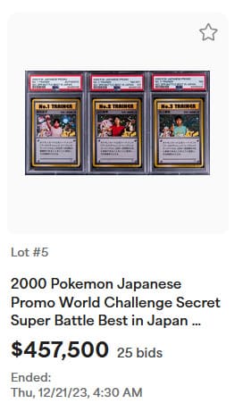 Diese exklusiven Pokémon-Trainerkarten sind absolut einzigartig! Sie wurden ausschließlich an die drei Erstplatzierten des „Secret Super Battle“-Turniers in Japan im Jahr 2000 verteilt und zeichnen sich durch ihre besonderen Illustrationen aus, auf denen die Gewinner selbst abgebildet sind. Ein komplettes Set aus allen drei Trainerkarten wurde im Dezember 2023 über Goldin Auctions für 457.500 US-Dollar (ca. 389.500 €) versteigert.