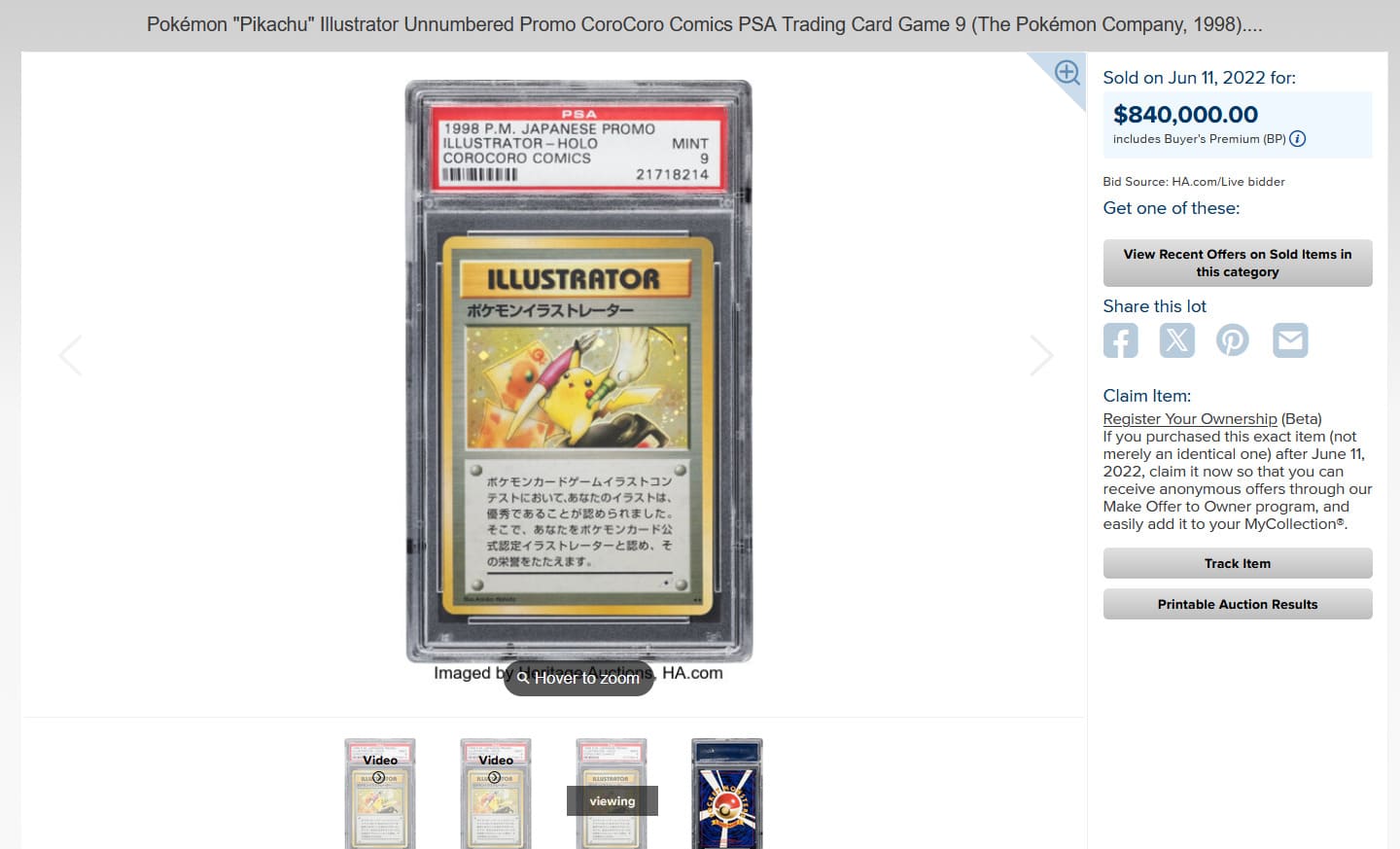 Am 30. Oktober 2022 wurde außerdem die weltweit einzige Pikachu-Illustrator-Karte mit der Bewertung „CGC 9.5“ für 672.000 US-Dollar (ca. 571.000 €) versteigert.