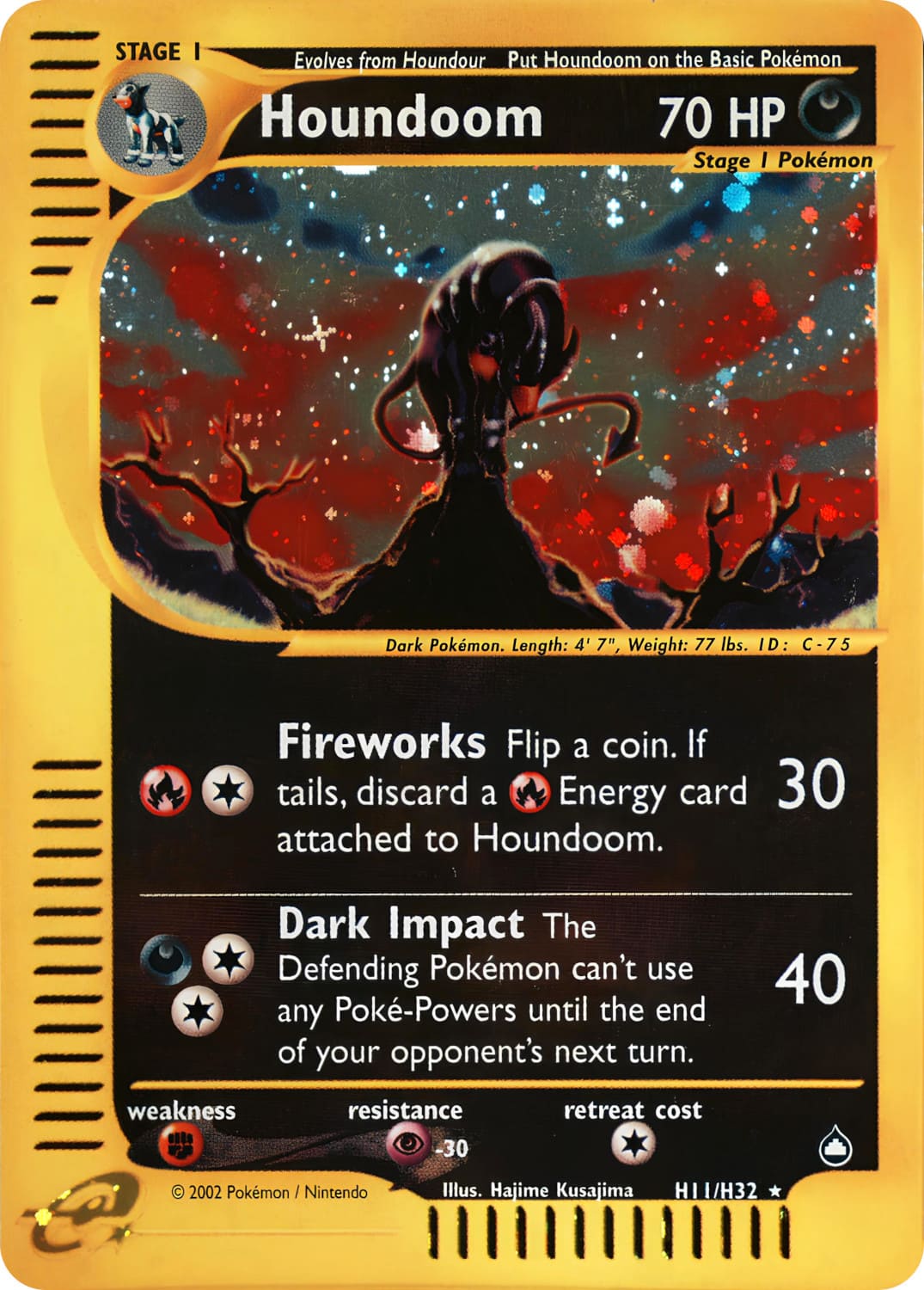 Vorsicht, bissig! Das unheimliche Hades-Pokémon Hundemon ist bekannt für seine düstere und gnadenlose Natur. Auf der Jagd lässt es ein schauriges Heulen ertönen, das sowohl Pokémon als auch Menschen vor Furcht erzittern lässt. Seine bedrohliche Pokémon-Karte wechselt aktuell für bis zu 5.300 € den Besitzer.