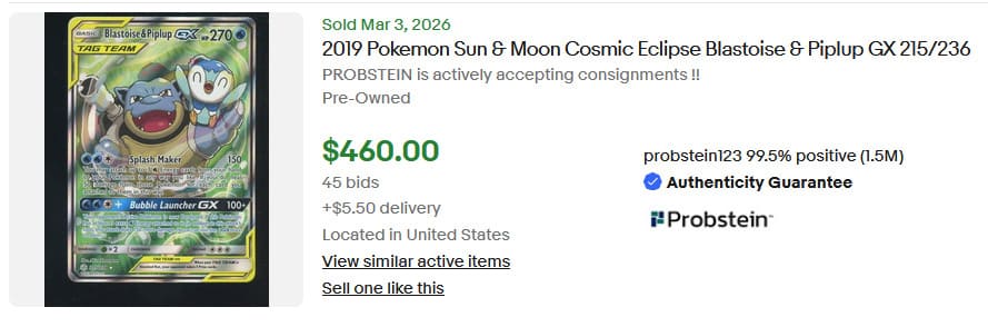 Wasseraction pur! Die kraftvolle Panzer-Schildkröte Turtok und das niedliche Pinguin-Pokémon Plinfa verteilen mit ihrer „Planscherei“ 150 Schadenspunkte und laden deine Wasser-Pokémon mit wichtigen Energiekarten auf. Für besonders harte Gegner haben sie den mächtigen „Blasenwerfer GX“ im Repertoire, der bis zu 250 Schadenspunkte austeilt. Ihre begehrte Alternate-Art-Karte ist im boosterfrischen Zustand derzeit zwischen 160 und 400 € wert.
