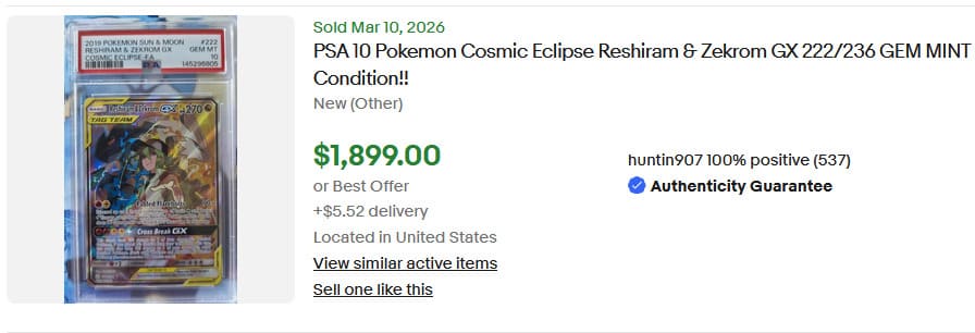 Die legendären Drachen-Pokémon Reshiram und Zekrom spielen eine zentrale Rolle in der Geschichte der Einall-Region. Reshiram symbolisiert die Suche nach Wahrheit und einer neuen Welt, die den Menschen Klarheit bringt. Zekrom, der schwarze Drache, verkörpert hingegen Träume, Wünsche und Fiktion. Auf dieser begehrten alternativen TAG-TEAM-GX-Karte erscheinen die beiden Drachen gemeinsam mit ihrem Trainer N. Der aktuelle Marktwert für boosterfrische Exemplare liegt bei etwa 230 bis 450 €. PSA-10-Karten haben sich zuletzt für bis zu 1.650 € verkauft. Damit schnappt sich das Duo zweiten Platz unter den wertvollsten Pokémon-Karten aus Welten im Wandel.
