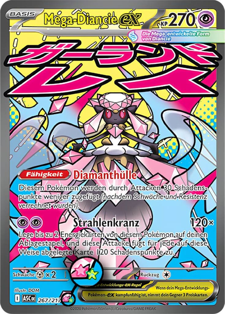 Mega-Hyper-Rare-Karten wurden erstmals in der neuen Mega-Serie eingeführt und zählen zu den seltensten Karten der aktuellen Erweiterungen. Sie zeigen mächtige Mega-Entwicklungs-Pokémon in exklusiven, vergoldeten Illustrationen. Im Durchschnitt erscheinen diese begehrten Schätze nur in einem von 1.000 bis 1.200 Boosterpacks.