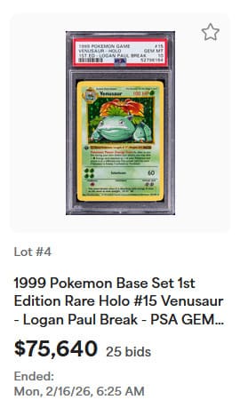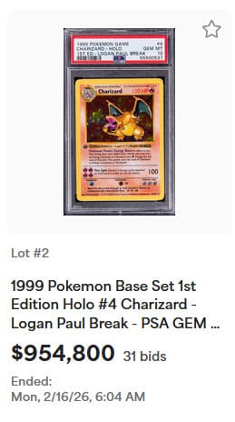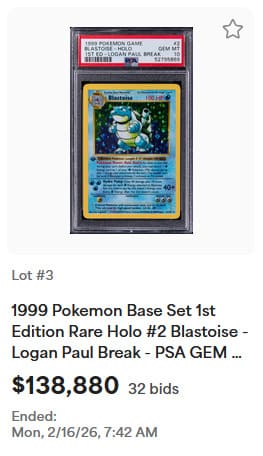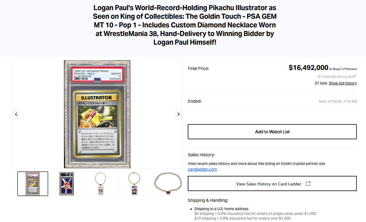 Nach über vier Jahren entschied sich Logan Paul nun, das einzigartige Sammlerstück beim renommierten US-amerikanischen Auktionshaus Goldin Auctions zur Versteigerung anzubieten. Neben der Karte selbst gehörte auch eine diamantbesetzte Goldkette zum Angebot. Laut beigefügtem Zertifikat liegt der Wert der Kette bei etwa 75.000 US-Dollar.