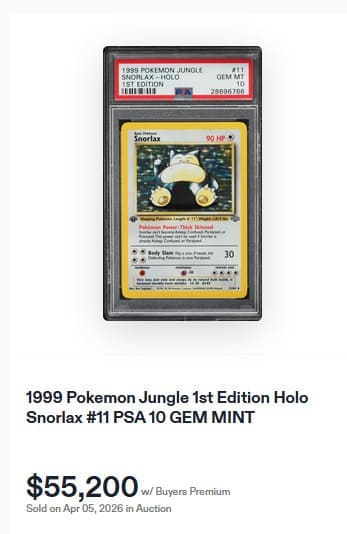 Das füllige Tagträumer-Pokémon Relaxo ist ein Dauerbrenner unter Fans der ersten Pokémon-Generation und gilt als wertvollste Karte aus der Erweiterung Dschungel. Vor wenigen Tagen erzielte ein englisches PSA-10-Exemplar einen neuen Spitzenpreis von 46.800 €.