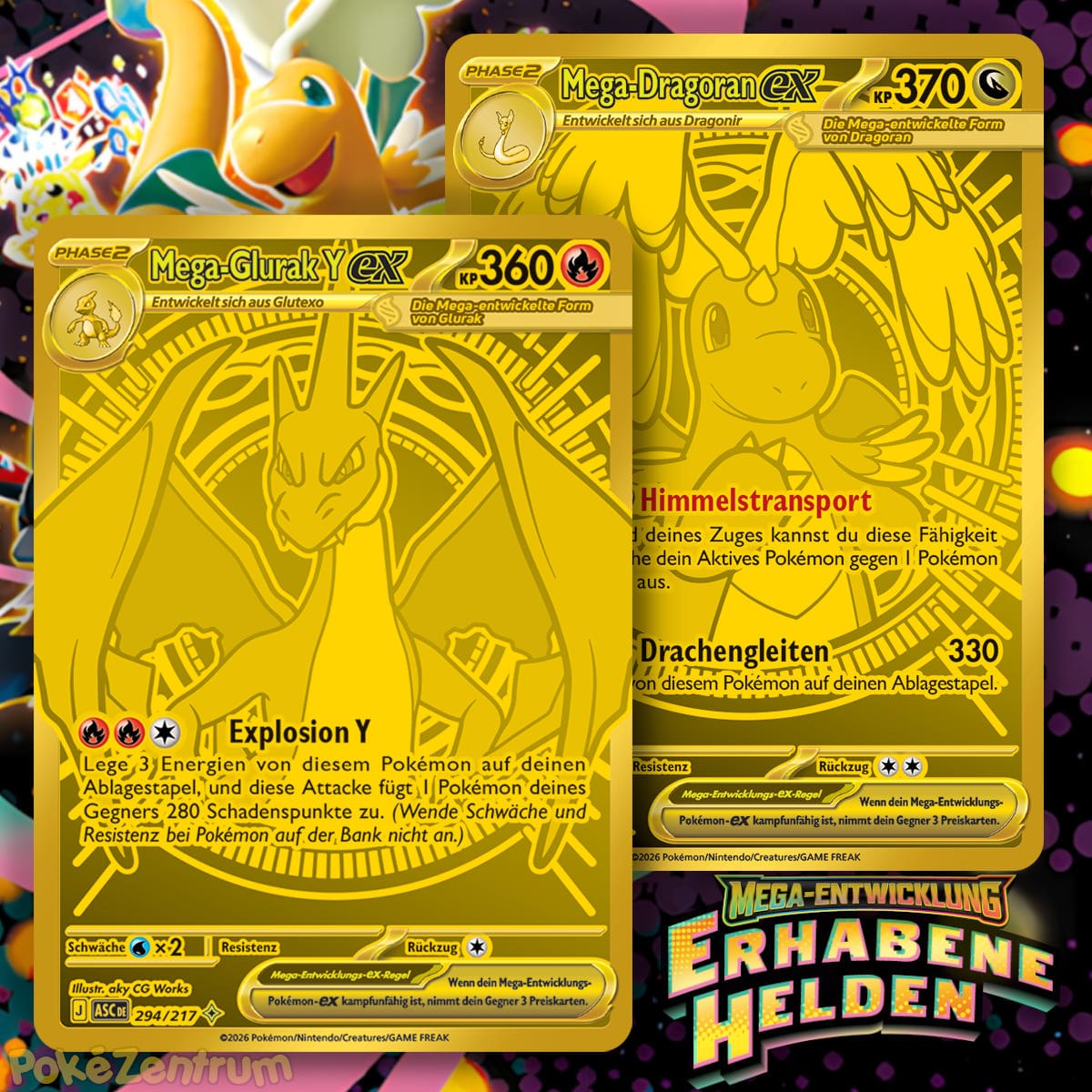 Sieh mit ehrfürchtigem Staunen zu, wie Mega-Dragoran-ex in die Lüfte emporsteigt und eine Pokémon-Starbesetzung in den Kampf führt! Trainer-Pokémon und Stellar-Terakristall-Pokémon-ex verbünden sich mit zurückkehrenden und neu entdeckten Mega-Entwicklungs-Pokémon-ex, von denen einige in ganz besonderen Illustrationen ihre größten und kühnsten Attacken zur Schau stellen. Feiere die Stars aus Karmesin & Purpur und den Anbruch von Mega-Entwicklung mit der Pokémon-Sammelkartenspiel-Erweiterung Mega-Entwicklung – Erhabene Helden!