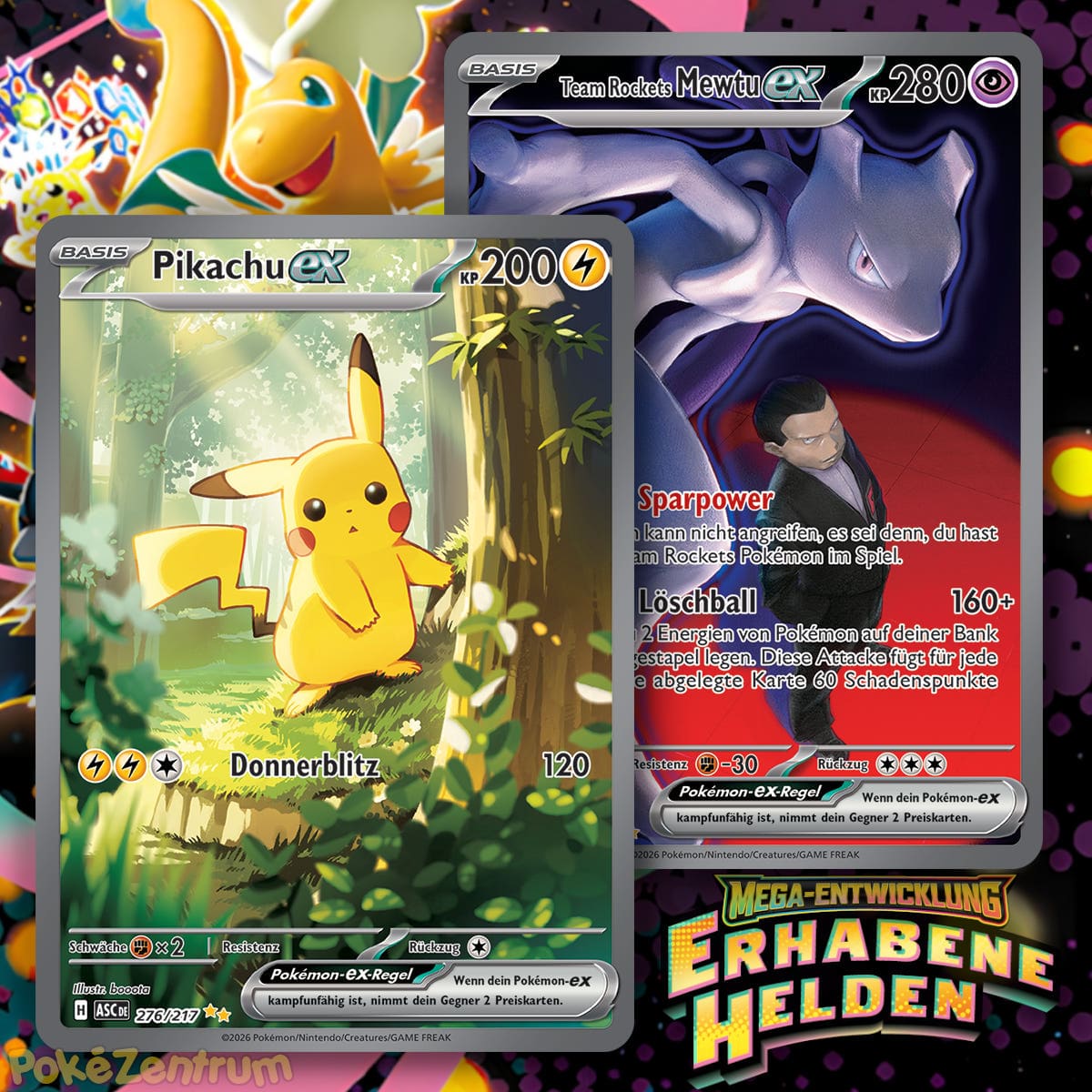 Derzeit können wir noch keine verlässlichen Angaben zu den Pull-Rates der Mega-Hyper-Rare-Karten aus Erhabene Helden machen. Wir vermuten jedoch, dass sie – genau wie in den vorherigen Sets – in etwa einem von 1.000 bis 1.200 Boosterpacks auftauchen.