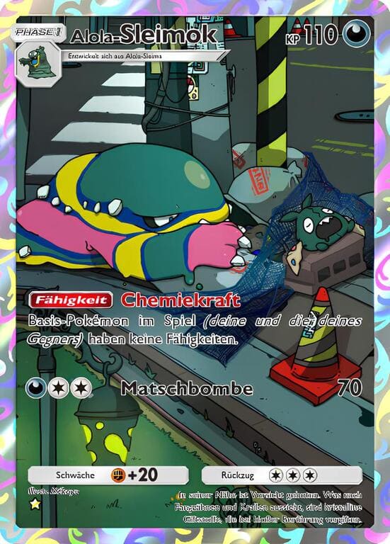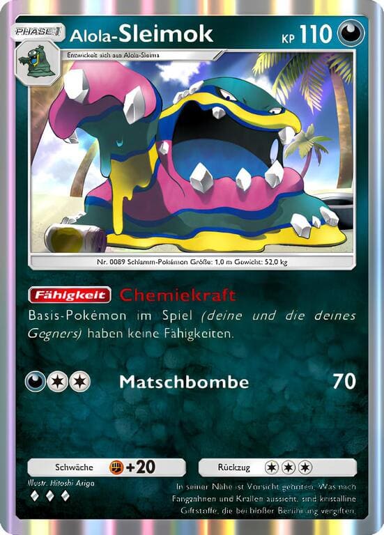 Alola-Sleimok sorgt mit seiner Fähigkeit „Chemiekraft“ für Aufsehen, denn sie deaktiviert die Fähigkeiten aller Basis-Pokémon im Spiel. So werden Bedrohungen wie Giratina-ex oder Choreogel, die in vielen erfolgreichen Decks enthalten sind, effektiv außer Kraft gesetzt.