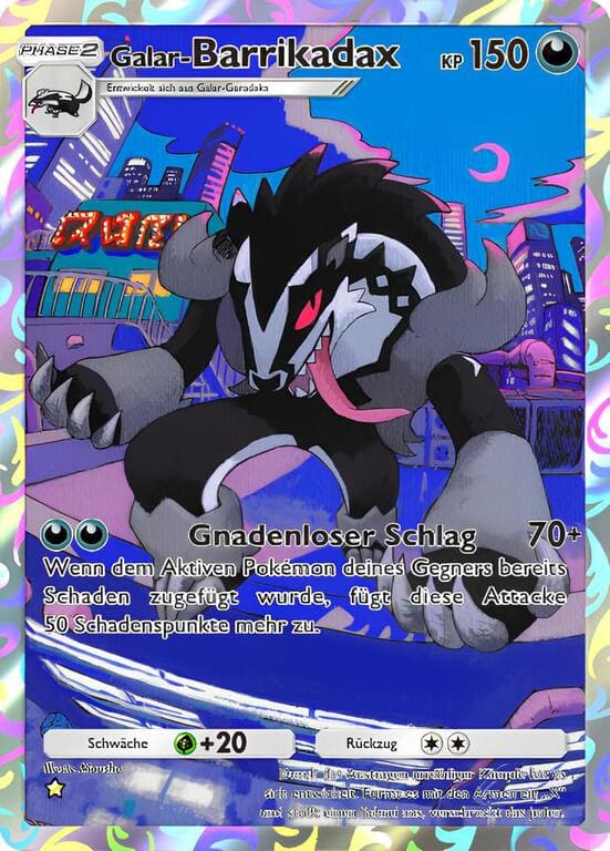 Das Barrikaden-Pokémon Galar-Barrikadax greift mit seiner mächtigen Attacke „Gnadenloser Schlag“ an, die bis zu 120 Schadenspunkte für nur zwei Energien verursacht, wenn dem gegnerischen Pokémon zuvor bereits Schaden zugefügt wurde. Unterstützer wie Darkrai-ex, Klingplim und der Beulenhelm helfen dem Finsternis-Pokémon dabei, sein volles Schadenspotenzial zu entfesseln.