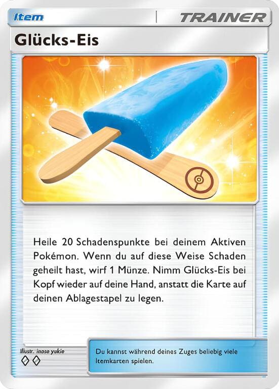 Das Glücks-Eis ersetzt in vielen erfolgreichen Decks den beliebten Trank. Dieses hilfreiche Item heilt 20 Schadenspunkte bei deinem aktiven Pokémon. Zusätzlich darfst du eine Münze werfen: Zeigt sie Kopf, kannst du das Glücks-Eis wieder auf deine Hand nehmen und später erneut einsetzen. Zwar ist die Heilung im Gegensatz zum Trank nur auf dein aktives Pokémon beschränkt, doch die Möglichkeit mehrerer Einsätze macht das Glücks-Eis zu einem äußerst mächtigen Item.