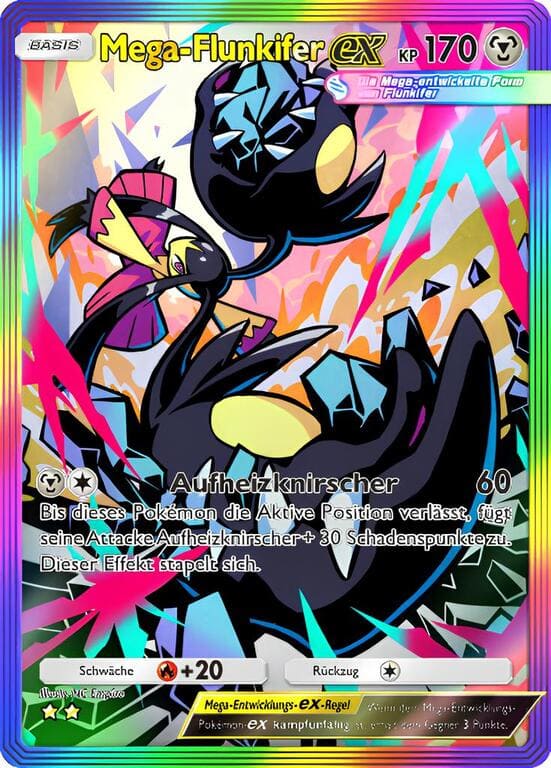 Der majestätische Umarmungs-Pokémon Mega-Guardevoir-ex steht im Rampenlicht des neuen Sets und beeindruckt mit 210 KP sowie dem mächtigen Angriff „Fantastische Kraft“, der für nur zwei Energien 110 Schadenspunkte verursacht. Außerdem darfst du drei Psycho-Energien aus deinem Energiebereich beliebig an deine Psycho-Pokémon anlegen. Dank dieser doppelten Rolle als Angreifer und Energiebeschleuniger ist Mega-Guardevoir-ex äußerst flexibel einsetzbar und lässt sich besonders gut mit energiehungrigen Pokémon wie Mewtu-ex kombinieren.