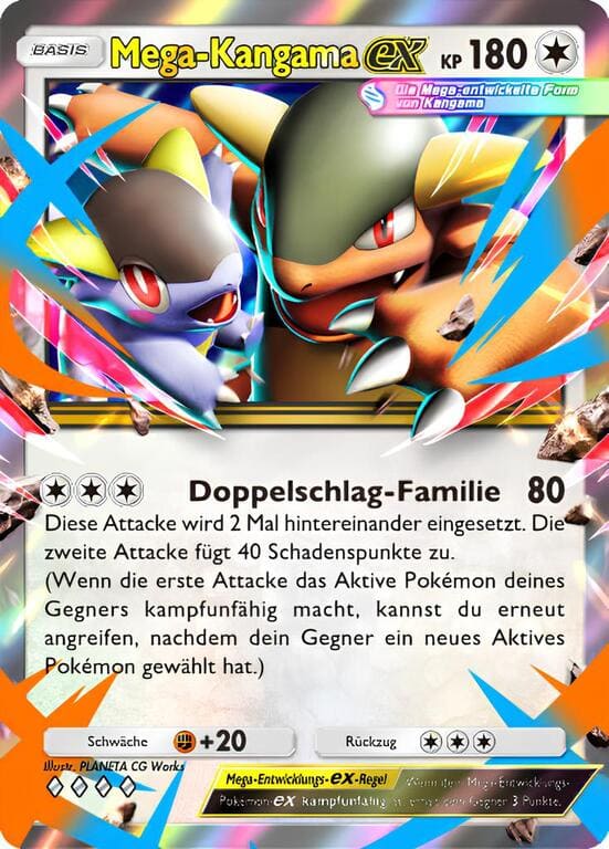 Das Basis-Pokémon Mega-Kangama-ex besitzt 180 KP und greift mit seiner Attacke „Doppelschlag-Familie“ zweimal hintereinander an. Die erste Attacke fügt 80 Schadenspunkte zu, die zweite Attacke 40 – insgesamt also 120 Schadenspunkte. Wird das gegnerische Pokémon nach dem ersten Schlag kampfunfähig, kannst du das neue aktive Pokémon deines Gegners erneut angreifen. Da Mega-Kangama-ex jeden Energietyp verwenden kann, bieten sich zahlreiche Baby-Pokémon wie Magby, Mantirps und Pichu zur Energiebeschleunigung an.