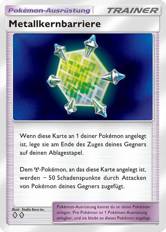 Die Metallkernbarriere sollte in keinem Metall-Deck fehlen. Sobald diese mächtige Ausrüstung an eines deiner Metall-Pokémon angelegt ist, verringert sie den Angriffsschaden durch gegnerische Attacken einmalig um 50 Punkte. Obwohl du sie am Ende des gegnerischen Zuges auf den Ablagestapel legen musst, lässt sie sich in Kombination mit Galar-Mauziger mehrfach einsetzen.