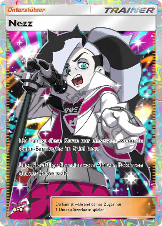 Nezz ist eine mächtige Unterstützerkarte, die ausschließlich in Galar-Barrikadax-Decks eingesetzt werden kann. Sie ermöglicht es dir, zwei zufällige Energien vom aktiven Pokémon deines Gegners abzulegen. Setze Nezz ein, sobald dein Gegner einen mächtigen Angreifer eingewechselt hat.
