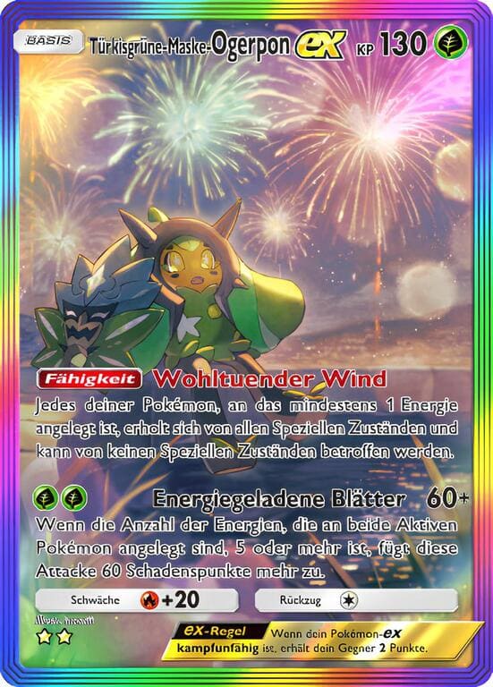 Das freche Masken-Pokémon Türkisgrüne-Maske-Ogerpon-ex entfesselt seine Fähigkeit „Wohltuender Wind“, die jedes deiner Pokémon, an das mindestens eine Energie angelegt ist, vor speziellen Zuständen schützt. Besonders interessant ist zudem seine Attacke „Energiegeladene Blätter“: Sie verursacht einen Grundschaden von 60 Punkten für zwei Pflanzen-Energien. Wenn die Anzahl der Energien, die an beide aktiven Pokémon angelegt sind, fünf oder mehr beträgt, steigt der Schaden jedoch auf 120 Punkte. Kombiniere die Attacke mit der Fähigkeit „Dschungelherrschaft“ von Serpiroyal aus der Erweiterung Mysteriöse Insel, um die an deine Pflanzen-Pokémon angelegten Pflanzen-Energien zu verdoppeln.
