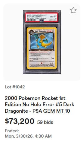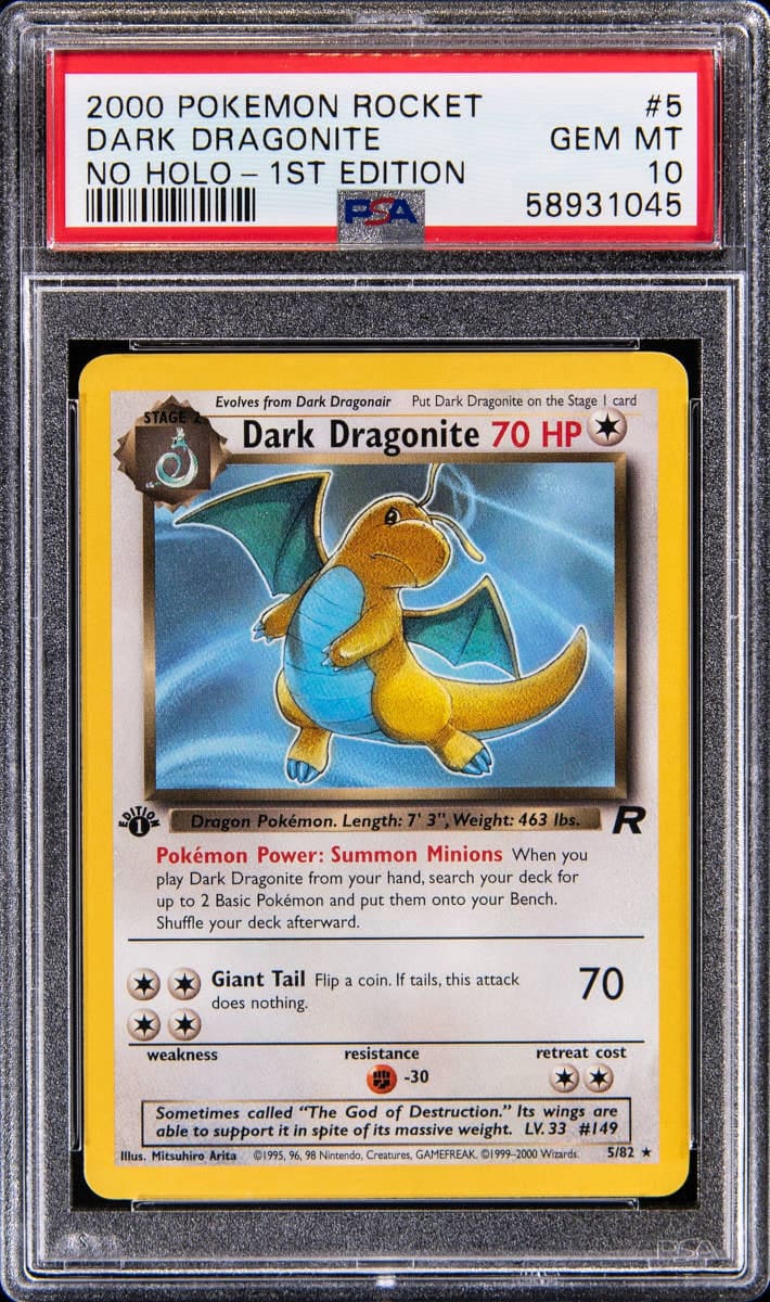 Die englische Variante der legendären Erweiterung Team Rocket enthält eine besonders seltene Error-Karte von Dunkles Dragoran. Während die holografische Variante mit der Kartennummer 5/82 versehen ist, trägt die nicht-holografische Variante normalerweise die Nummer 22/82. Doch während der Produktion kam es zu einem Fehler: Einige nicht-holografische Karten wurden fälschlicherweise mit der Kartennummer 5/82 gedruckt – einer Nummer, die eigentlich ausschließlich der holografischen Version vorbehalten war. Wie viele dieser Error-Karten insgesamt existieren, ist nicht bekannt. PSA hat bislang nur 81 dieser Fehldrucke bewertet – lediglich fünf davon erhielten die begehrte Höchstnote. Eine dieser Karten wurde am 30. März 2026 für beeindruckende 73.200 US-Dollar (ca. 63.400 €) versteigert. Zuletzt wechselte ein PSA-10-Exemplar im März 2022 für 12.600 US-Dollar (ca. 10.900 €) den Besitzer.