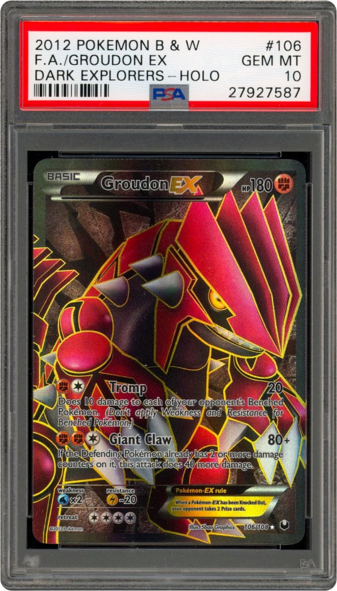 Das gigantische Kontinent-Pokémon Groudon feierte im Jahr 2012 in der Erweiterung Erforscher der Finsternis aus der Schwarz & Weiß-Serie seine Premiere als mächtiges Pokémon-EX. Besonders begehrt ist die geprägte Full-Art-Karte von Groudon-EX. Weltweit existieren nur 18 makellose PSA-10-Exemplare. Am 19. November 2025 wurde das brandheiße Sammlerstück für 16.400 US-Dollar (ca. 14.200 €) versteigert.