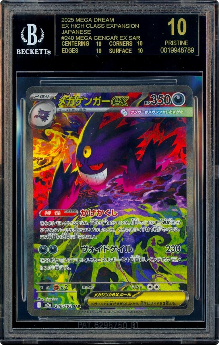 Das fiese Schatten-Pokémon Mega-Gengar-ex erscheint in der japanischen Erweiterung Mega Dream ex auf einer gemäldeartigen Illustrationskarte, die in keiner Gengar-Sammlung fehlen sollte. Während unbewertete Exemplare für etwa 250 bis 380 € erhältlich sind, wurde eine seltene Black-Label-Karte kürzlich für 13.100 US-Dollar (ca. 11.300 €) versteigert. Insgesamt hat Beckett nur vier Exemplare mit dem begehrten Black Label ausgezeichnet.